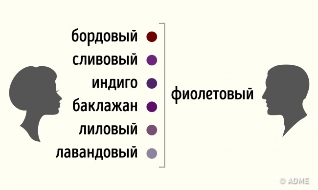 Науково доведено, що дівчата розрізняють більшу кількість кольорів, ніж чоловіки, тому що тут вся справа в генах. Внаслідок чого чоловіки частенько виходять з себе, коли дівчина намагається довести різницю між баклажанным і бузковим.