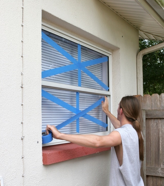 Якщо залишаєтеся всередині будівлі, заклейте вікна скотчем, щоб захиститися від осколків розбитого скла.