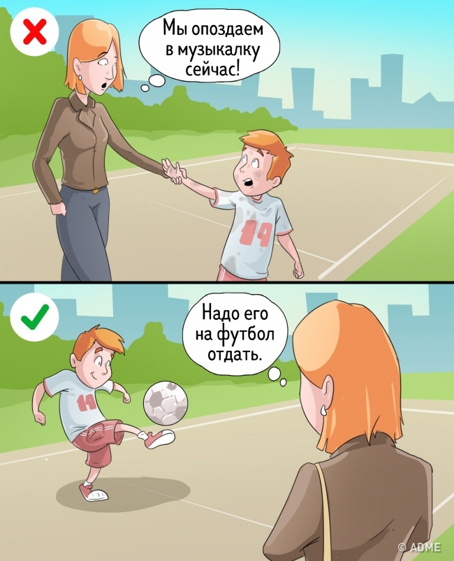 Мамі так хочеться, щоб дочка грала на скрипці, і вона готова возити її через все місто в музичну школу тричі на тиждень. А тато наполягає, щоб син кожен вечір бігав на тренування з футболу. І найчастіше батьки підсвідомо намагаються нав'язати дітям або модне хобі, або власні нереалізовані амбіції.