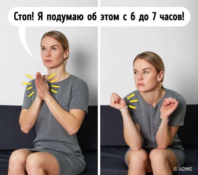 Хлопніть в долоні і крикніть «Стоп! Я подумаю про це потім!». Також можна носити гумку на зап'ясті і клацати себе їй (або просто вщипнути себе). Використовуйте подібні подразники, щоб зупинити круговерть думок і відкласти проблему на потім, на певний час. Потім постарайтеся переключити свою увагу на який-небудь незвичайний предмет або заняття.