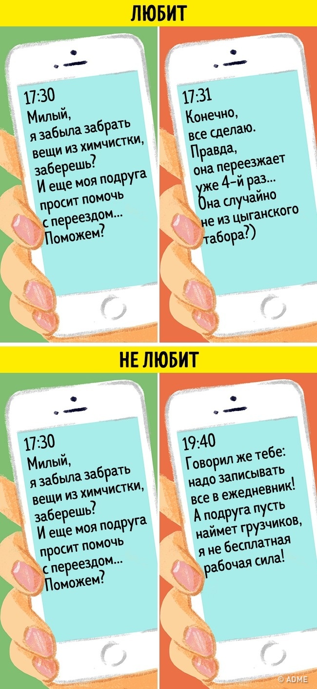 Для люблячого чоловіка на першому місці завжди будуть прохання і бажання коханої дівчини (а не приятелів або далеких родичів). Насправді чоловікам подобається допомагати жінкам — це дає їм можливість продемонструвати, які вони круті, сильні і відповідальні. Звичайно, бувають ситуації, коли чоловік не в силах допомогти сам, наприклад, він не вміє лагодити протекший кран, але він точно не повинен залишати вас одну розбиратися з цією проблемою, він викличе сантехніка. Якщо ж сама безневинна прохання типу «милий, вкрути, будь ласка, лампочку» сприймається з бурчанням як чергова непосильне завдання, варто задуматися — а чи не допомагає ваш чоловік якійсь іншій жінці, причому з набагато більшим ентузіазмом?