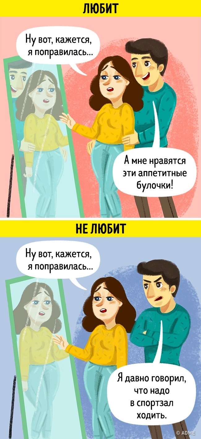 Є таке мудре висловлювання Омара Хайяма: «В коханій людині подобаються навіть недоліки, а в нелюбимому дратують навіть гідності». Для істинно люблячого чоловіка ви завжди прекрасні, навіть розхристана і в піжамі, що дісталася від бабусі. Він і не помітить, що ви набрали кілька зайвих кілограмів після зимових свят, якщо ви самі не скажете про це. А ось якщо чоловік постійно жене вас в спортзал або натякає, що вам потрібна пластична операція, не поспішайте потурати йому. Швидше за все, якщо його не влаштовує ваша зовнішність — його не влаштовуєте і ви самі. І навіть якщо ви схуднете, він все одно знайде до чого причепитися.