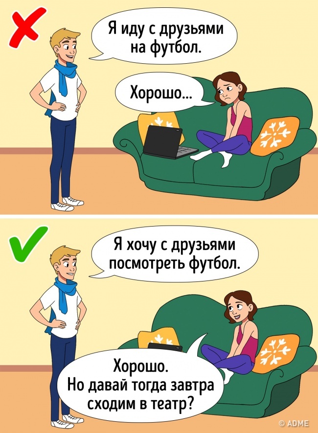 Звичайно, розставляти всі крапки над «i» — це нормально і правильно, але не забувайте про компроміси. Якщо ви не будете поступатися коханій людині у дрібницях (а він, відповідно, вас), то вас чекає багато нездорових конфліктів, і в кінцевому підсумку — розставання.