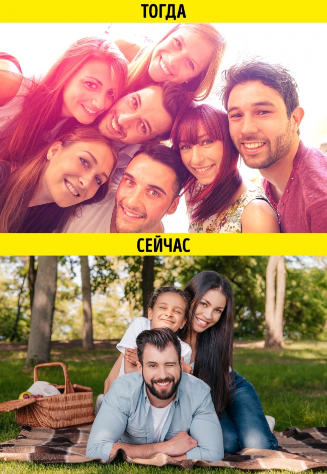 Як це відбувається: На що в основному йде життя дорослої людини? На роботу і сім'ю. Тому, якщо ви встигли обзавестися своїм гніздечком, а ваш друг немає, то дуже складно зберігати колишні відносини. Взагалі весілля — це найрадісніша і найдраматичніше подія в житті: на неї запрошують самих близьких друзів, і зазвичай на цьому торжестві негласно оголошується фінальний акорд відносин з ними. У сімейному житті вашими друзями стають колеги і батьки друзів вашої дитини.