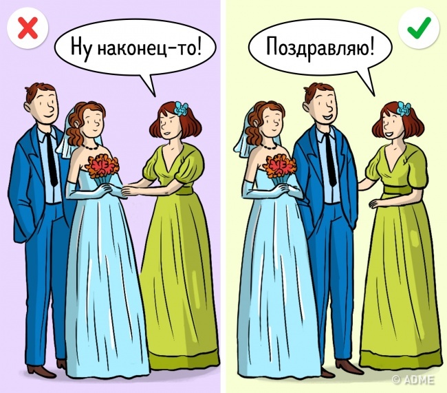 Несподівано, але за правилами етикету вітати потрібно тільки нареченого, а нареченій просто бажати щастя. Причина найромантичніша: це чоловік завоював жінку і отримав її в дружини, а тому саме він заслуговує щирих привітань.