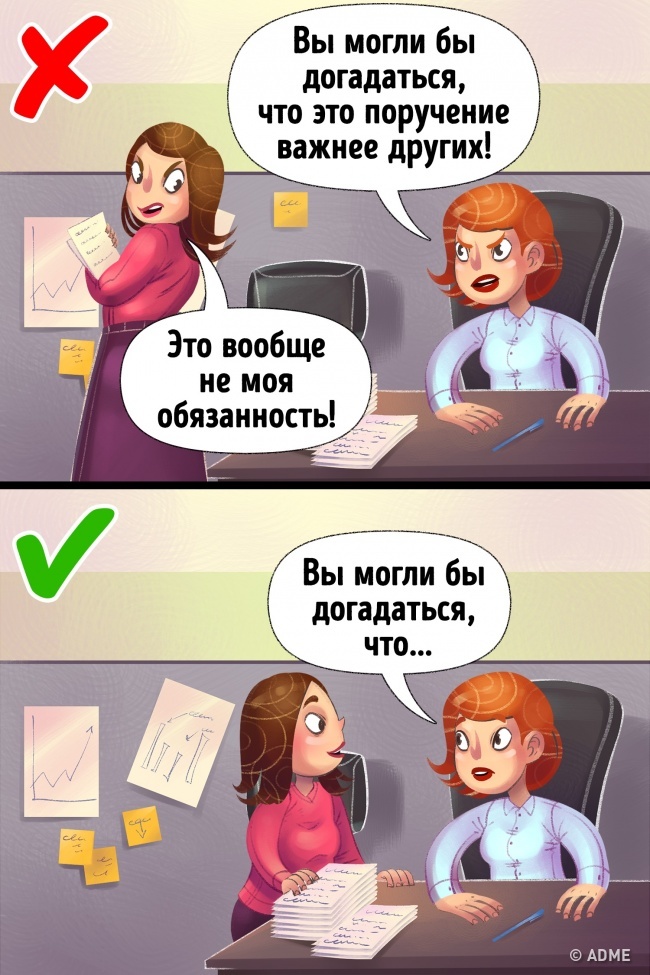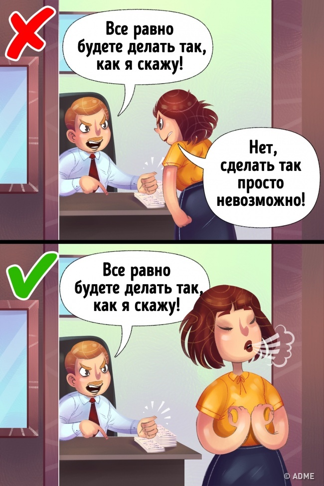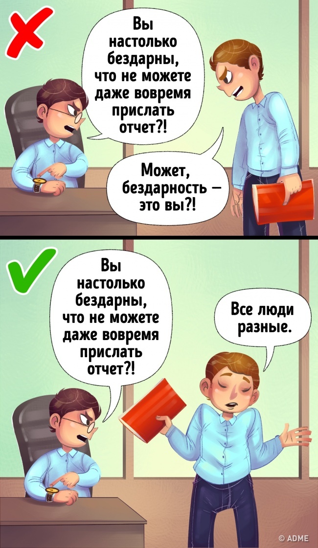 - Погоджуйтеся з тим, що здається вам дивним. Наприклад, вам кажуть: «Цей звіт не можна затримувати ні на секунду! Могли б звернутися за допомогою, якщо вам так важко зробити все вчасно!» А ви у відповідь: «Ви маєте рацію, можливо, мені варто розвинути своє вміння випрошувати допомогу».