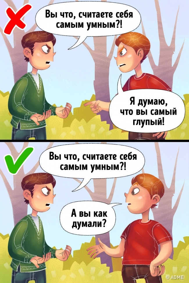 Використовуйте тактику постановки запитань, так як ними ви можете зупинити грубіяна. Не бійтеся відповідати питанням на питання — це теж сильний інструмент.