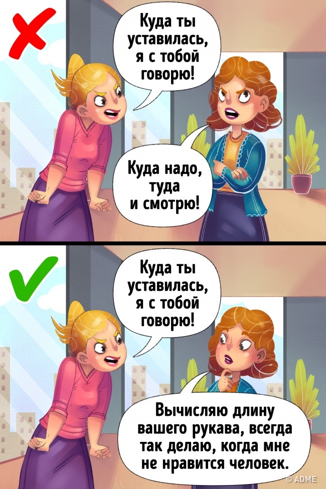 Якщо на вас кричать, зупиніть свій погляд на чому-небудь, наприклад на рукавах співрозмовника. На питання «на що це ти там витріщився?» можна відповісти так: «Я вираховую довжину вашого рукава. Завжди так роблю, коли мені не подобається людина». Замішання опонента допоможе завершити сцену нехай не зовсім мирно, але в тиші і без посилення конфлікту.