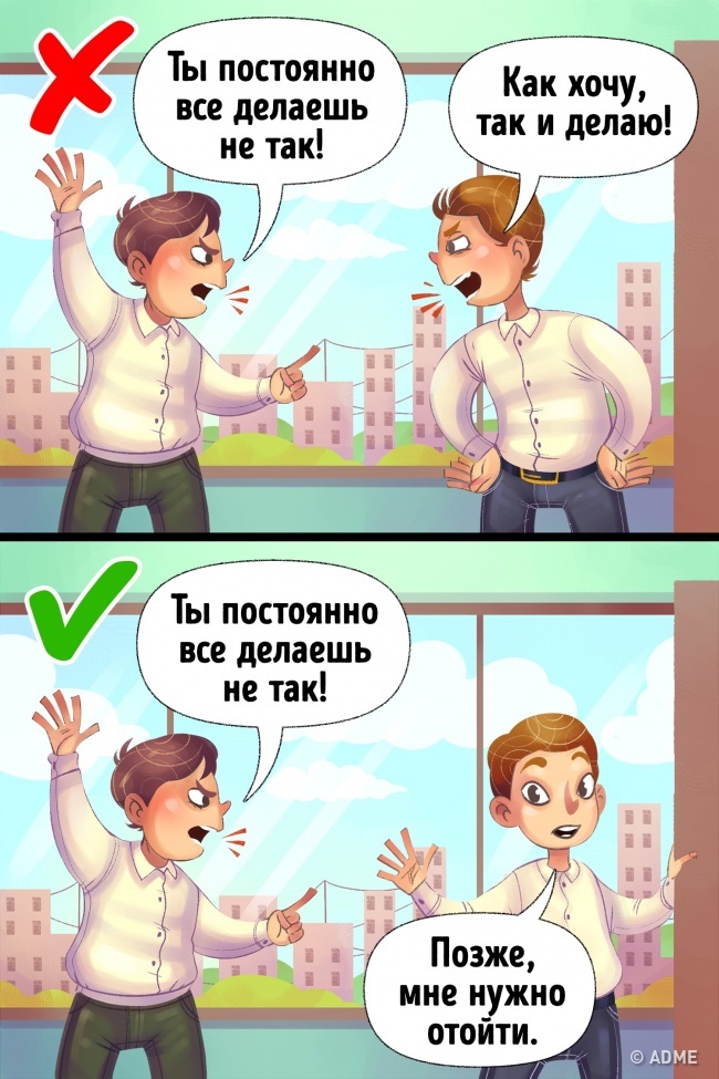 Завжди намагайтеся піти від конфлікту, причому в прямому сенсі: підіть з кімнати, кабінету, квартири і так далі.