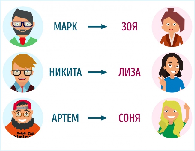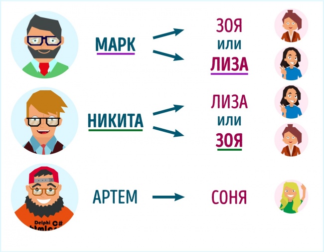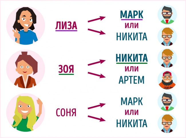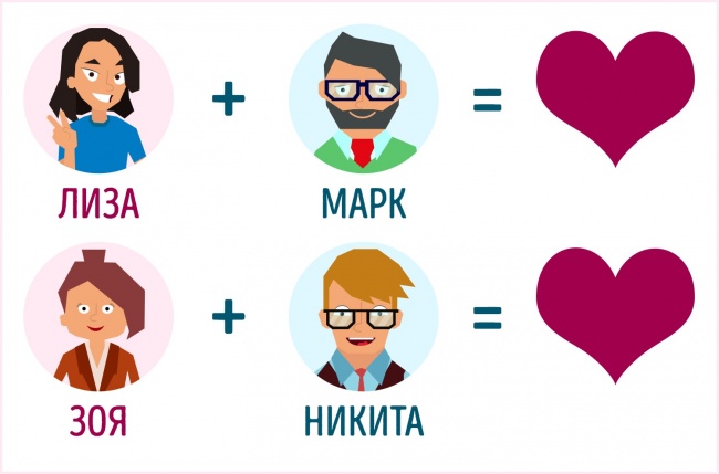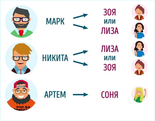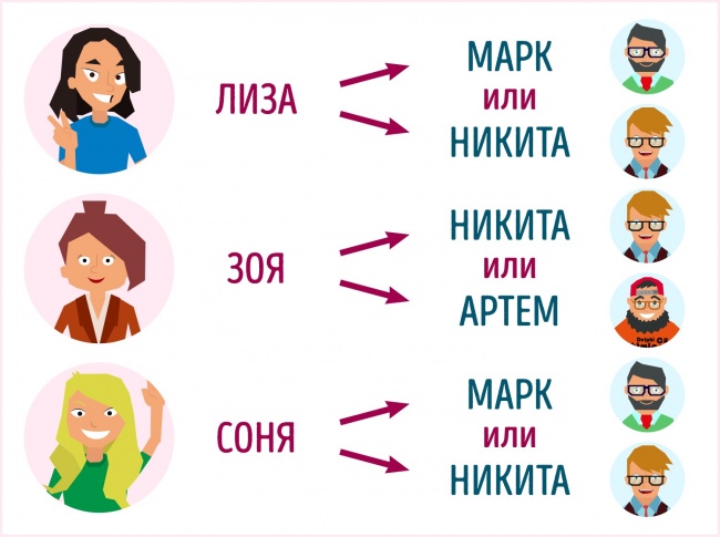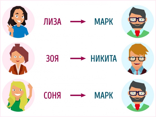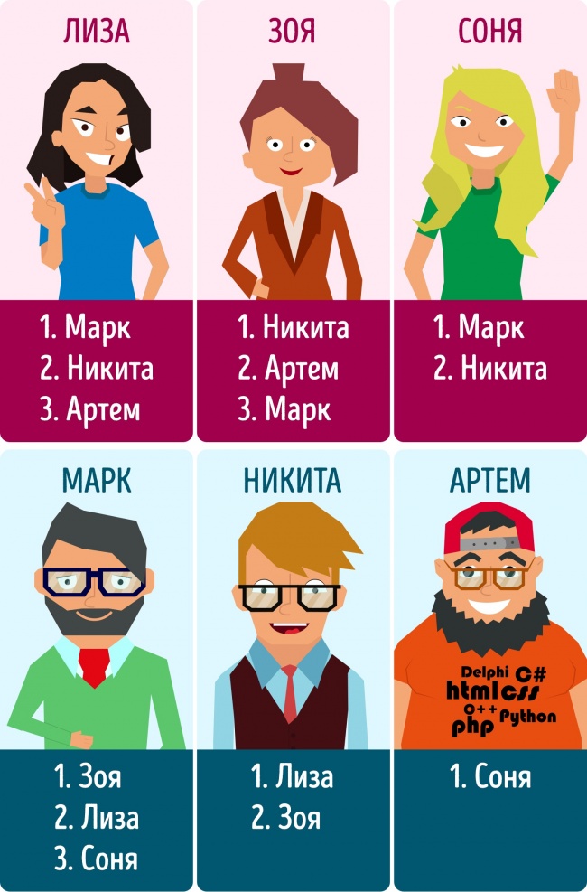 Уявімо собі компанію. 3 жінок і 3 чоловіки. Так виглядають їх списки із симпатіями: