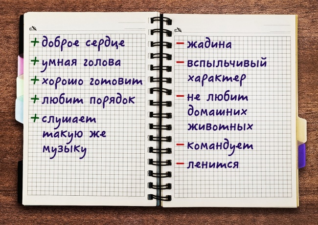 Розділіть аркуш А4 на 2 колонки. У 1-й колонці запишіть 5 якостей, які обов'язково повинні бути у вашого партнера. У 2-й — 5 якостей в іншій людині, з якими вам буде складно ужитися.