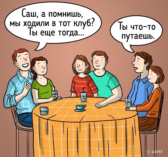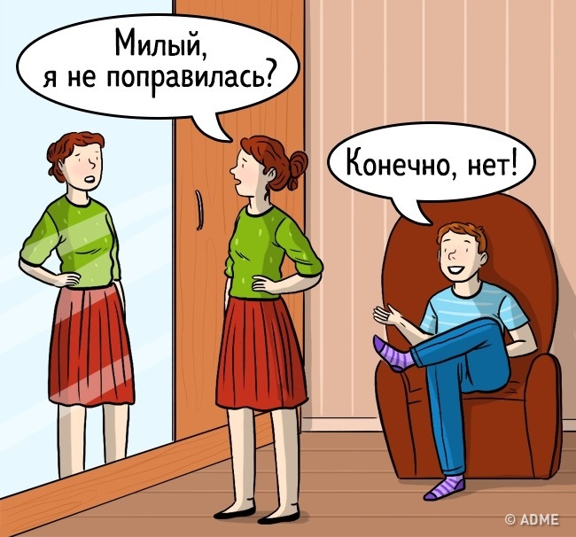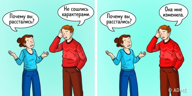 Якщо на питання «Чому ви розлучилися?» він каже тобі: «Не зійшлися характером», читай: «Я весь час вів себе по-свинськи», або повторює: «Вона мені змінила», читай: «Я кинув її, і не самим приємним способом». Чоловік не хоче зізнаватися навіть собі в тому, що вів себе, м'яко кажучи, некоректно, тому краще зам'яти цей момент перед новою обраницею.