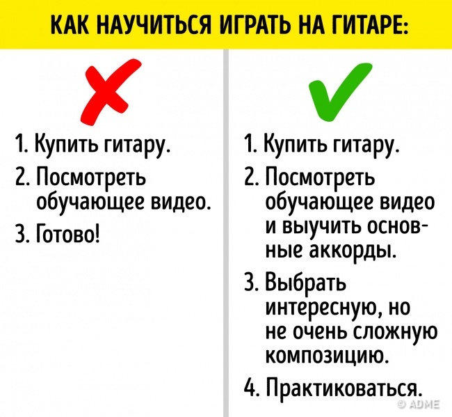 Важливо не займатися прокрастинацією, відкладаючи сам момент практики. Так, щоб почати, необхідні знання про предмет, але читання 20 книг про гітарі не замінить вам години практики з нею.