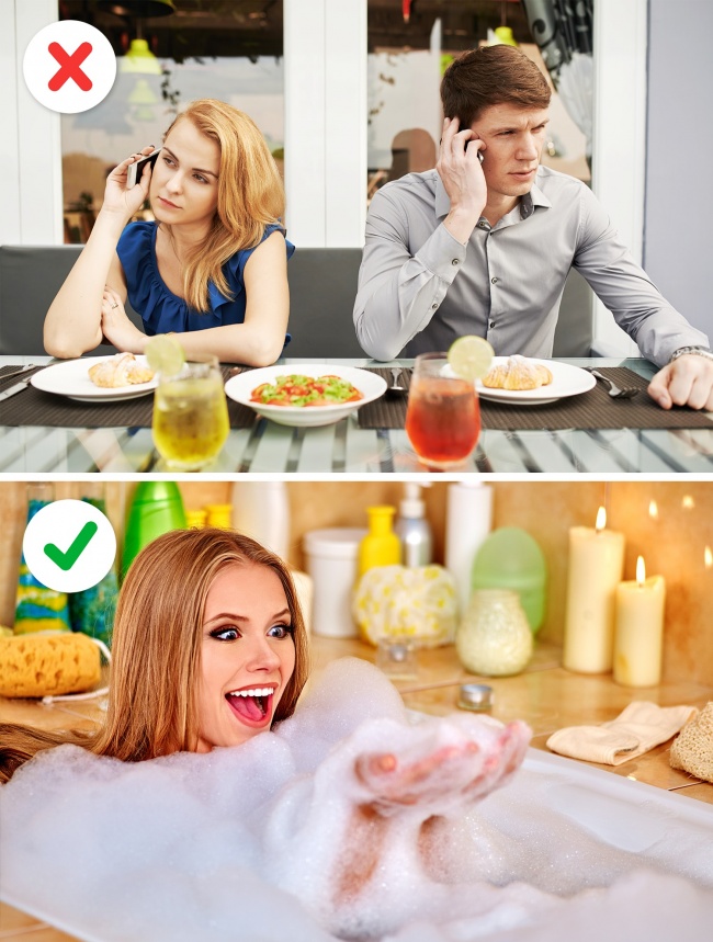 Заповнювати вихідні справами по максимуму, але навіть у найприємніші моменти не розслаблятися, а намагатися встигнути якомога більше: не треба так. Навіть якщо справ дійсно багато, постарайтеся отримувати з них частинки задоволення. А ще краще дозвольте собі хоча б 20 хвилин спокою, чашку гарячого шоколаду або ванну з піною в кінці кінців.
