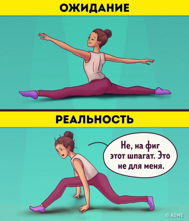 Через 25 хвилин після початку заняття Маша, задихаючись від болю, зрозуміла, що робота займе рік, а може, і не один. Їй ДУЖЕ далеко до шпагату, а дотягнути до балерини взагалі навряд чи вийде. І як тільки усвідомила Маша реальний стан справ, вся її готовність чекати результату випарувалася. Мотивація стухла, потім з'ясувалося, що шпагат не так-то вже й хочеться, краще з подружками вина попити.