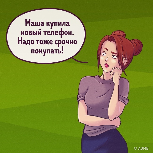 Дивлячись на інших, ми часто думаємо, що вони талановитіший і успішніше. І прагнемо вперед: отримати кращу освіту, знайти більш круту роботу, купити житло — одним словом, оволодіти всіма атрибутами розкішного життя. Така гонка з постійною оглядкою, а не купила чи подружка телефон крутіше, дуже вимотує.