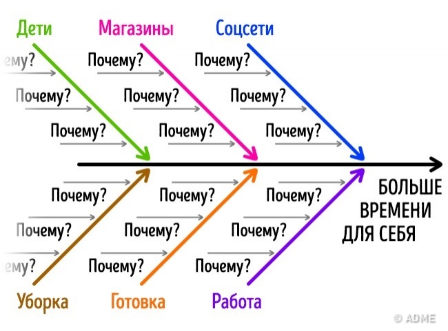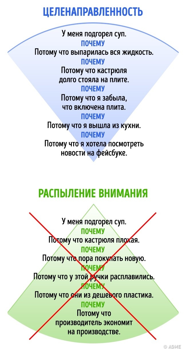 Техніка неймовірно проста. Все, що вам потрібно, — це задати питання «чому?» 5 разів. Кожен відповідь стане наступним питанням. Якщо питання стосується відносин між людьми, то не шукайте відповіді в поведінці іншої людини. Шукайте їх у своєму ставленні до його поведінки. Розглянемо на простому прикладі.