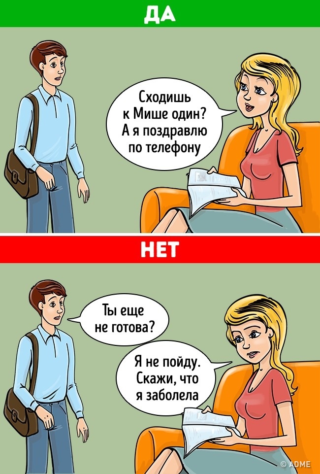Ваш партнер не хоче когось бачити і змушує вас брехати? Це тривожний сигнал. Або він не може самостійно вирішити проблему, просто сказавши «ні» тому, з ким не хоче бачитися. Або він не хоче бачити ваших друзів або близьких і тому вважає, що і придумувати для нього відмовки повинні ви.
