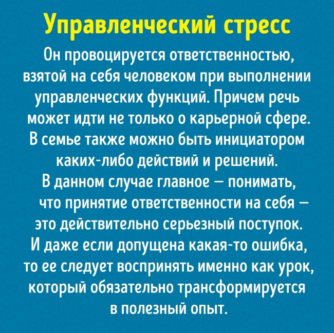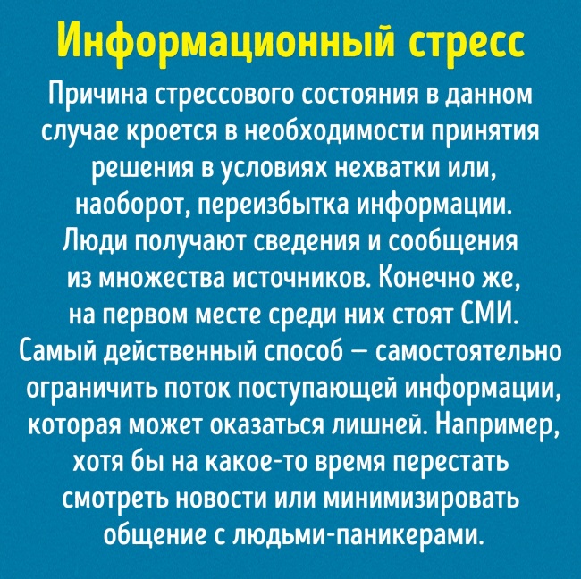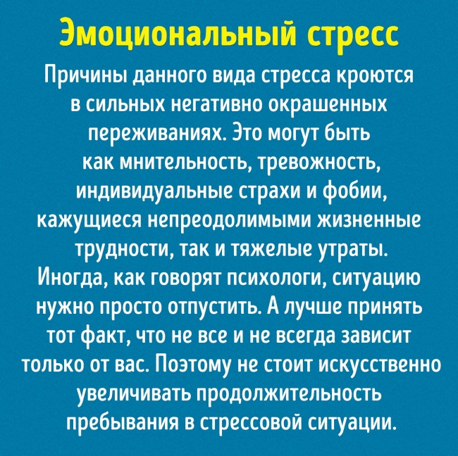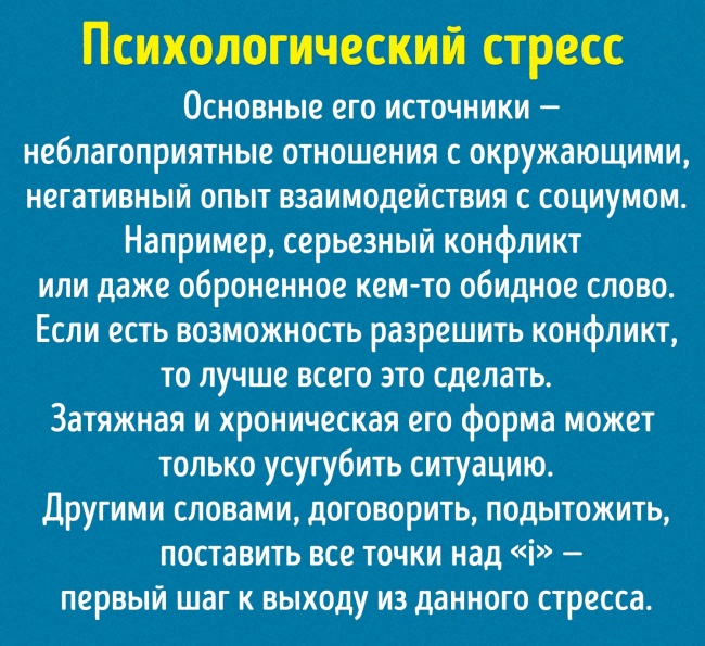 Фактори, що викликають стрес, надзвичайно індивідуальні. Наприклад, незначна сутичка в громадському транспорті для однієї людини може абсолютно нічого не значить, а для іншого стати джерелом найсильніших переживань. Незалежно від причини стресу з ним завжди потрібно боротися, оскільки це впливає на імунітет і позначається на здоров'ї.