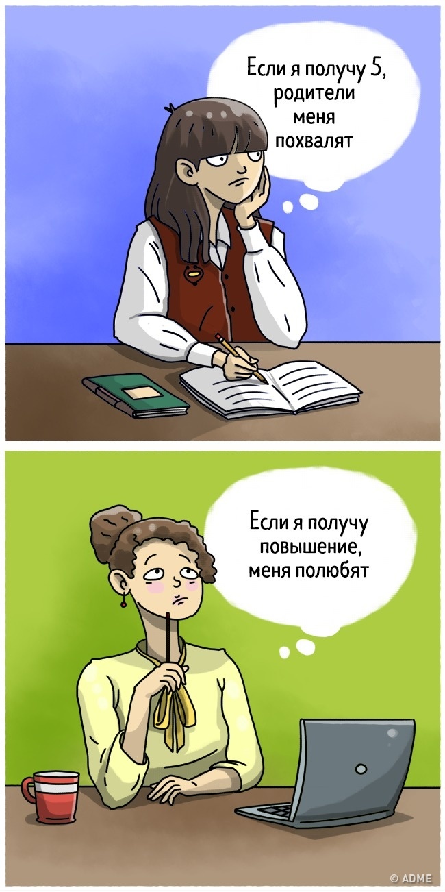 У дитинстві нас хвалили за п'ятірку і вимитий посуд, а лаяли за порвані джинси і безлад у кімнаті. Ось і виходить, що в голові закріплюється установка: якщо поруч є щось неправильне, значить, неправильний я.