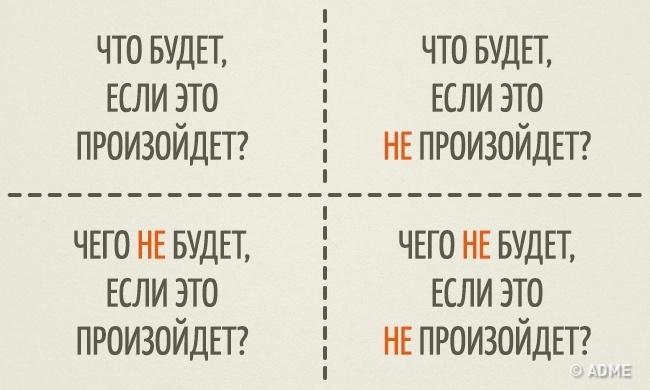 Цьому прийому Social.org.ua присвятив окрему статтю. Секрет його ефективності в тому, що, приймаючи складні рішення, ми часто зациклюємося лише на одному питанні: що буде, якщо це станеться? Квадрат Декарта допомагає розглянути ситуацію з декількох сторін і зробити більш усвідомлений вибір.