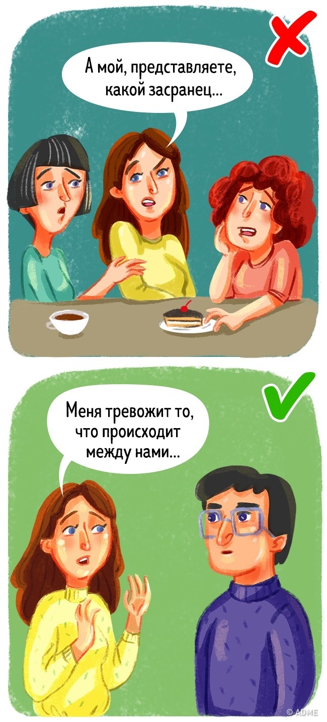 Ніколи не говоріть погано про свого партнера третім особам. Від слова «зовсім». Ні мамі, ні подругам. У вас сварка пройде, ви все забудете і даруйте один одного. А мама чи подруги не забудуть. Ваш партнер так і залишиться для них поганим, і вони будуть налаштовані до нього негативно.