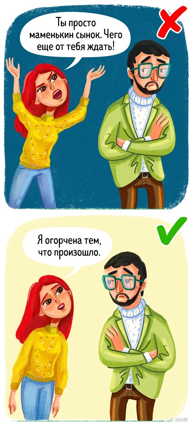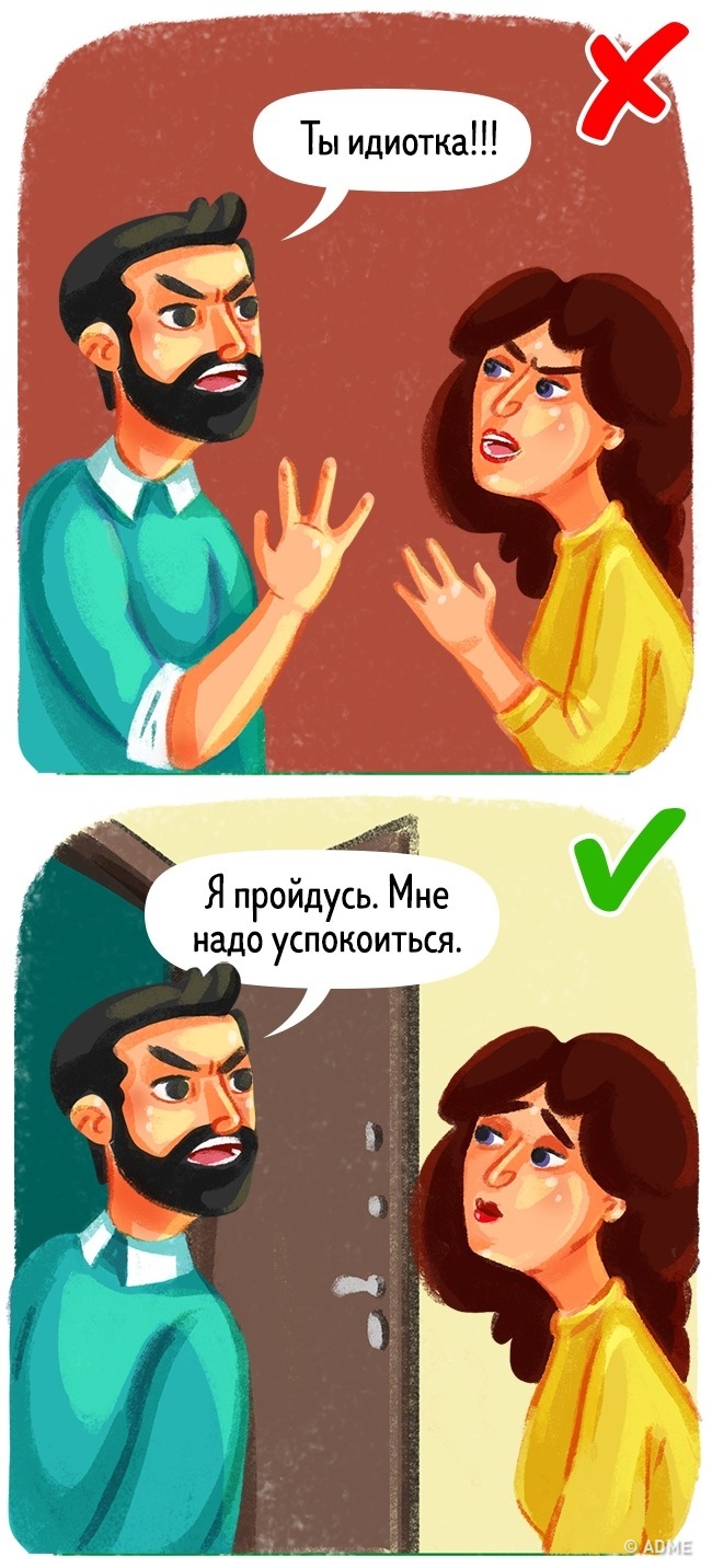 Спробуйте внутрішньо говорити собі «стоп» всякий раз, як ви хочете сказати близькій людині образливе слово. Якщо ви відчуваєте, що не можете впоратися з собою, візьміть паузу. Тільки не використовуйте це як маніпуляцію, караючи партнера ізоляцією. Скажіть, що повернетеся до розмови, коли заспокоїтеся. І неодмінно виконайте своє слово.