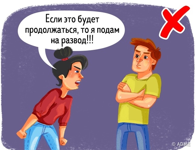 Уникайте фраз на кшталт «Якщо це буде продовжуватися, я піду від тебе». І не вимовляєте слово «розлучення». А якщо вже ви збираєтеся його вимовити, то будьте готові до походу в ЗАГС і розділу майна. Щоб не потім повзати на колінах зі словами «Я не те мав на увазі», якщо партнер несподівано скаже: «Окей, йди».