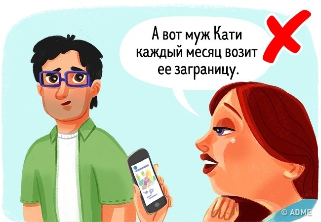 Пожалійте себе і свої відносини, не порівнюйте свого чоловіка (дружину) з чоловіками подруг, особливо незнайомих людей в инстаграме та інших соціальних мережах. Навіть подумки, а вголос тим більше.
