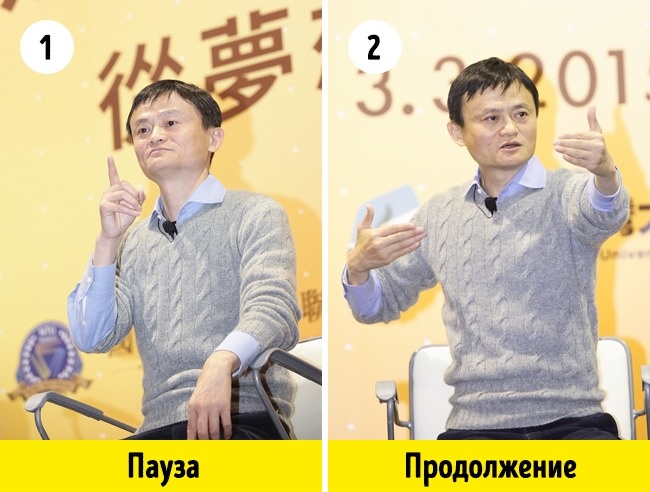 Джек Ма, засновник Alibaba Group, завжди орієнтується на аудиторію, щоб в кінці важливого інформаційного блоку у неї було кілька секунд на реакцію. Він зупиняється, щоб послухати реакцію глядачів і підкреслити завершеність або важливість щойно сказаного.
