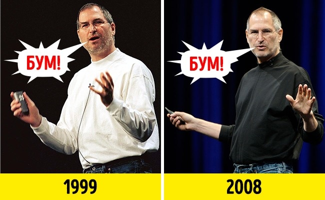 Так, наприклад, Джобс в особливо важливі моменти свого виступу, щоб привернути увагу аудиторії, говорив слово «бум!». Рекордним став виступ Джобса на «Worldwide Developers Conference — 2003», де це слово прозвучало 37 разів.