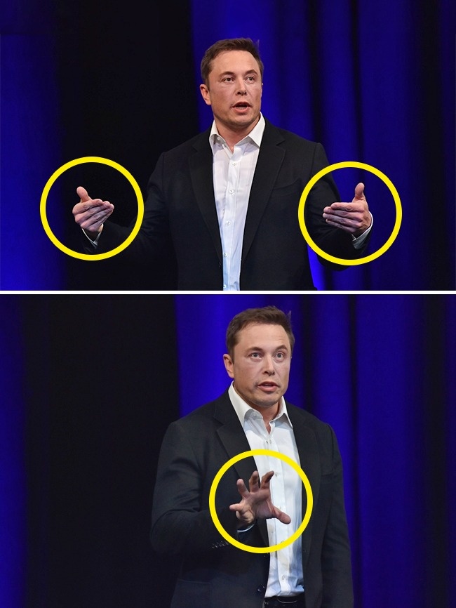 Виступаючи на сцені, Ілон Маск завжди активно жестикулює. Жести, які він використовує, допомагають йому виглядати впевнено, розставляти акценти в найбільш важливих місцях промови. Таким способом Маск підкреслює висловлювання, в яких впевнений, і змушує глядачів повірити в них.