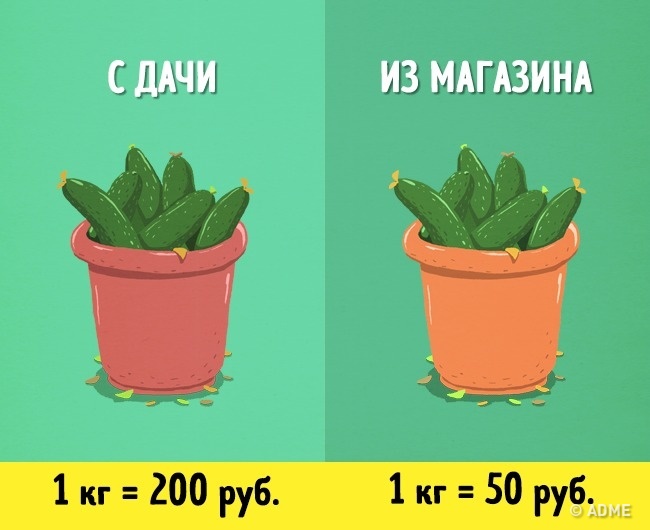 Подумайте, скільки часу займе виростити відерце огірків, враховуючи дорогу до дачі, полив і підв'язку, в порівнянні з простою і швидкою їх покупкою в супермаркеті.