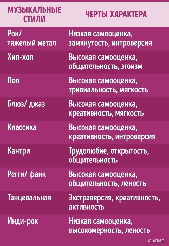 Анкетування довело, що люди, захоплені одним і тим самим музичним жанром, схожі за характером і манерою поведінки у суспільстві, включаючи тих, хто любить різні стилі. Пара улюблених жанрів все одно є у кожного, стверджують дослідники.
