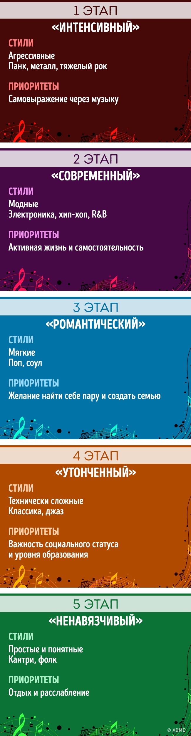 В різні періоди життя ми любимо різну музику. Це пов'язано з розвитком особистості, психологічними і соціальними потребами. Вчені з Кембріджського університету провели дослідження і виділили 5 основних етапів прояви і зміни музичного смаку. Виявилося, чим старше ми стаємо, тим легше музика в нашому плей-листі. Крім того, на короткострокові зміни музичних уподобань впливають емоційні стани: ностальгія, печаль, радість і біль.