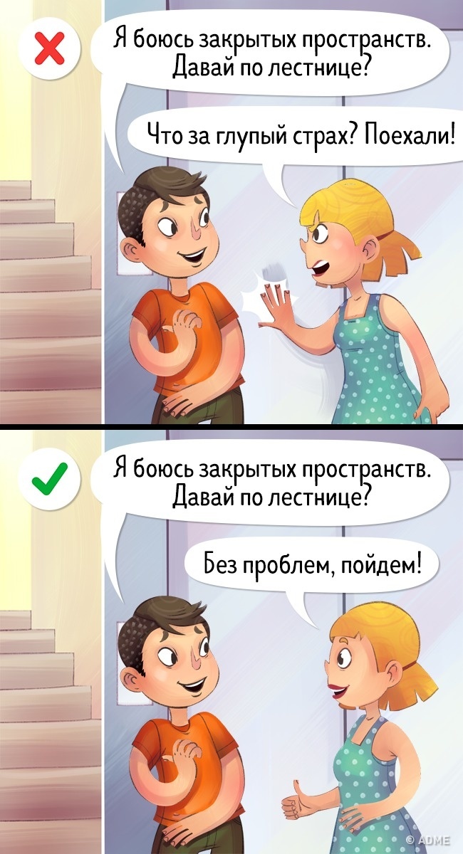 Як правильно: Поставтеся з повагою до слів співрозмовника про страх: «Я розумію тебе. Давай не будемо цього робити/ про це говорити».