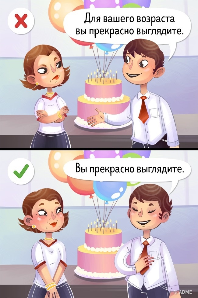Як правильно: Відмовтеся від формулювання «для вашого віку» і просто зробіть комплімент: «Ви чудово виглядаєте».