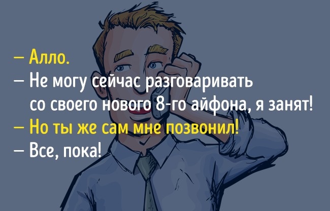 Звичайно, немає нічого поганого в тому, що ви купили iPhone 8 тому, що він зручний, а без функції розпізнавання обличчя ви просто не уявляєте свого життя. Але якщо людина самостійно погіршив якість свого життя (а кредит саме про це) лише для того, щоб почути «ні фіга собі, у нього 8-ої айфон», що можна сказати про його розумі?