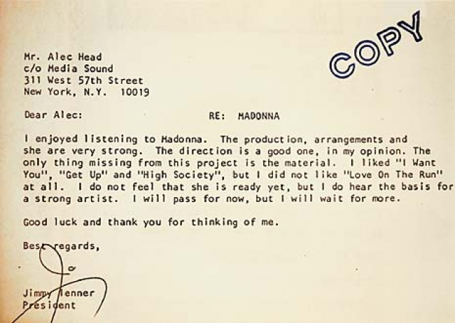 У листі вище директор студії відмовляє Мадонні, пояснюючи своє рішення тим, що співачка ще «сира». Коли контракт на цей альбом все ж був підписаний, він розійшовся по всьому світу кількістю понад 10 млн. Ще приклад? Джоан Роулінг отримала 14 відмов перед публікацією книги «Гаррі Поттер і філософський камінь».