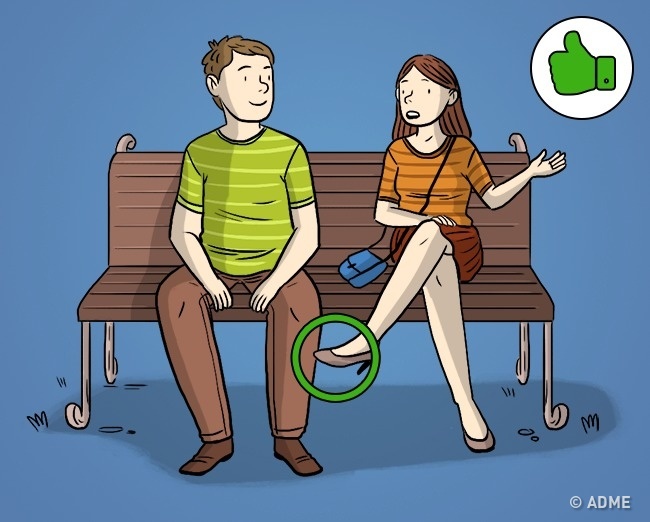 Якщо в розмові або на прогулянці ваш партнер весь час намагається повернутися до вас корпусом — це очевидна ознака зацікавленості. І навіть коли він закине ногу на ногу — носок взуття обов'язково буде направлений до вас.