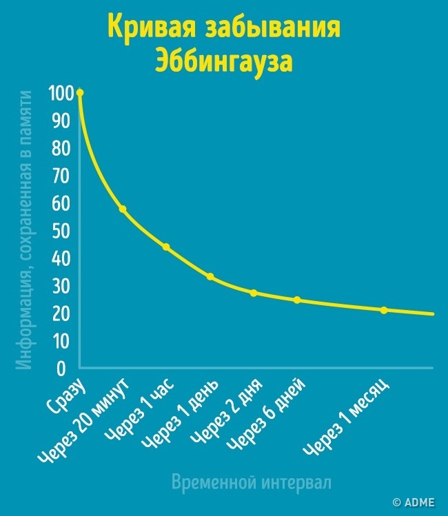 «Крива забування» Еббінгаузом показує, що вже через 1 годину після заучування ми забуваємо більше половини інформації. А через тиждень пам'ятаємо лише 20 %.