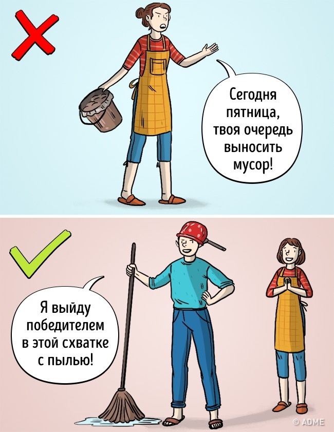 Що робити? Креативити! Загальні жарти і традиції, зміна обов'язків перетворюють рутинні справи на кшталт прибирання і готування в захоплюючу гру. Будьте простіше. Побалуйте себе, замовивши піцу або відправившись в улюблене кафе на вечерю замість того, щоб готувати з останніх сил. Відкладіть прибирання з суботи на «пізніше». Або затейте змагання в дусі «хто швидше витре пил» з приємними призами.