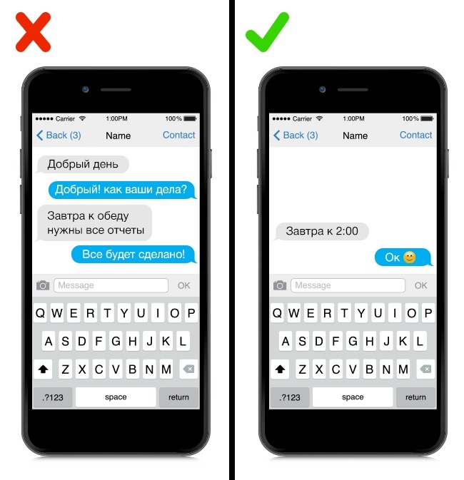 При написанні повідомлень, так само як при запису голосової пошти, важливо пам'ятати про стислості. Пишіть коротко і по суті. А для того щоб висловити дружелюбність і додати приємних емоцій, використовуйте емодзі або знак дужки.