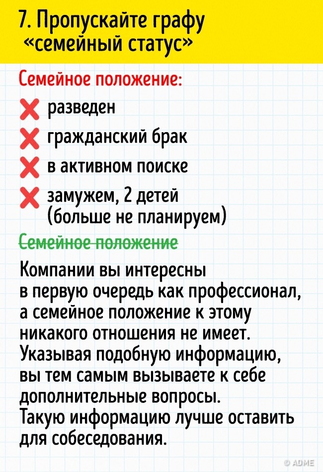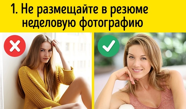 Фотографії в бікіні з відпочинку або занять в тренажерному залі не варто прикріплювати до резюме. Компанію ви цікавите як фахівець, тому і фотографія повинна бути під стать. Інакше ви ризикуєте наштовхнути рекрутера сумніви: чи справді ви розумієте мету своєї роботи?
