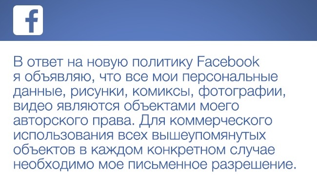 Ймовірно, ви бачили схожі повідомлення у себе в стрічці. А може бути, ви і самі розміщували щось подібне на своїй сторінці. Як з'ясувалося, користі від цього повідомлення ніякої — воно абсолютно ні на що не впливає і не здатне захистити чиїсь авторські права. Міф виявився на диво живучим: попередження продовжують циркулювати в соцмережах ось уже кілька років.