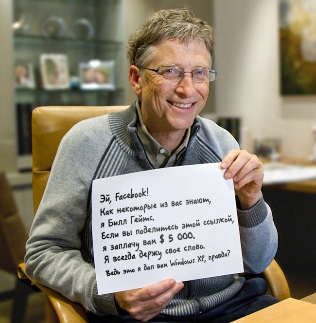 В деяких випадках і справді можна виграти квитки у кіно або косметику, але навряд чи хтось буде роздавати гроші всім охочим в соцмережах. Тому дивно, як багато людей повірили в атракціон небаченої щедрості від Білла Гейтса і почали репостить цю картинку. Білл Гейтс, звичайно ж, справжній, на відміну від оголошення у нього в руках.
