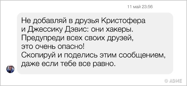 З року в рік люди отримують попередження про хакерів, текст яких практично не змінюється, за винятком хіба що імена міфічних лиходіїв. Наприклад, в цьому році їх звуть Джесіка і Крістофер Девіс. І хоча хакерські атаки — загроза цілком реальна, не варто приймати такі попередження всерйоз. Тим більше що справжнім «Джесіці і Крістоферу» зовсім не потрібно додаватися до вас у друзі, щоб зламати ваш аккаунт.