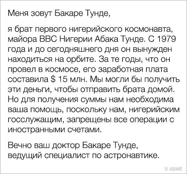 І нарешті, самий шкідливий з усіх існуючих інтернет-міфів: листи, які обіцяють вам можливість розбагатіти. У них може фігурувати нігерійський «принц», чий статок ви раптово успадкували, або космонавт, якого ви можете «врятувати», словом, будь-яка принада, на яку у шахраїв вистачить фантазії.