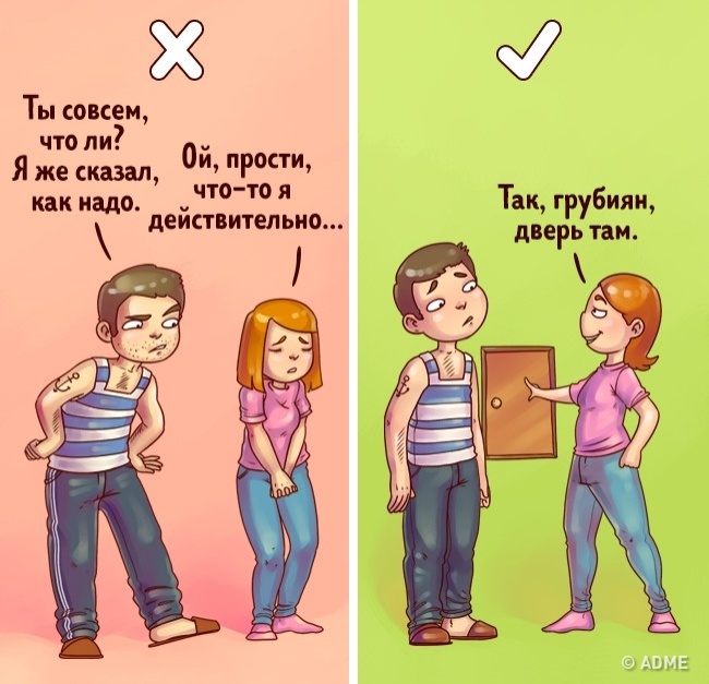 Ви не відчуваєте, коли вас починають наїжджати. Або закриваєте очі на ці маленькі незручності. Але грубіян точно не стане вас за це любити і поважати. Так заради чого терпіти?