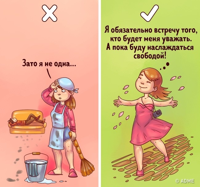 - Не потрібно вибирати між відносинами і почуттям власної гідності. Якщо стоїть такий вибір, значить, щось пішло не так. Будьте сміливішими, не бійтеся змін. Сприймайте самотність як свободу, і ви не пробудете довго одні.